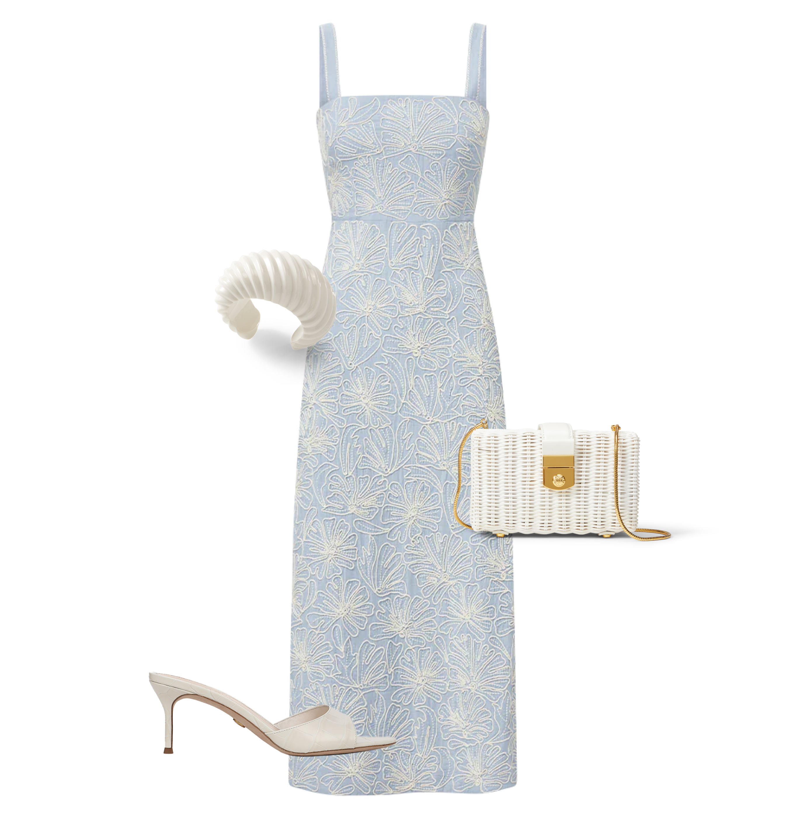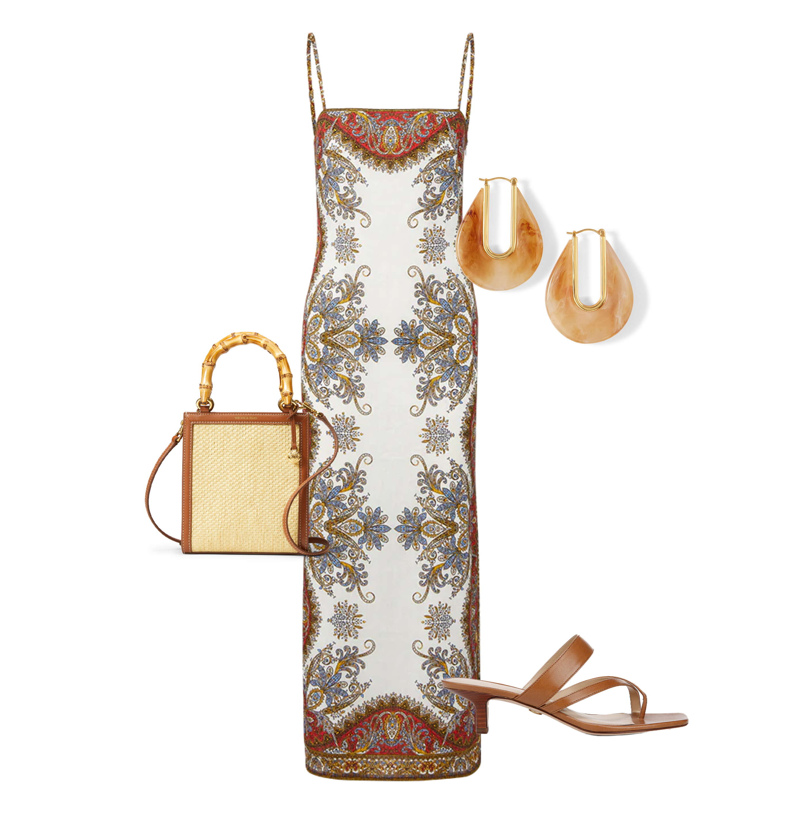 Pour les cérémonies estivales, privilégiez les tissus légers et aériens. Pensez aux options raffinées comme le lin, le coton, les broderies et la soie, qui vous apporteront fraîcheur et confort tout en respectant les codes vestimentaires. Côté couleurs, les pastels doux, les couleurs vives et les imprimés estivaux sont parfaits pour la saison, tout comme les tons neutres classiques comme le noir. Plus important encore, pensez au cadre lorsque vous choisissez votre tenue pour un mariage estival : une mini-robe élégante associée à des talons classiques est idéale pour une réception semi-formelle, tandis qu'une robe midi ou longue fluide, associée à un élégant sac en raphia , conviendra mieux à une cérémonie en plein air plus décontractée.