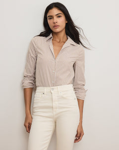 Une chemise boutonnée classique ne se démode jamais. Confectionnée avec soin en popeline de coton impeccable et extensible pour plus de confort, la chemise rayée marron Amelia présente un col ajusté, de larges poignets droits et des pinces au niveau de la poitrine pour une finition féminine. Considérez-la comme un ajout intemporel à votre garde-robe que vous pouvez associer avec tout et n'importe quoi.