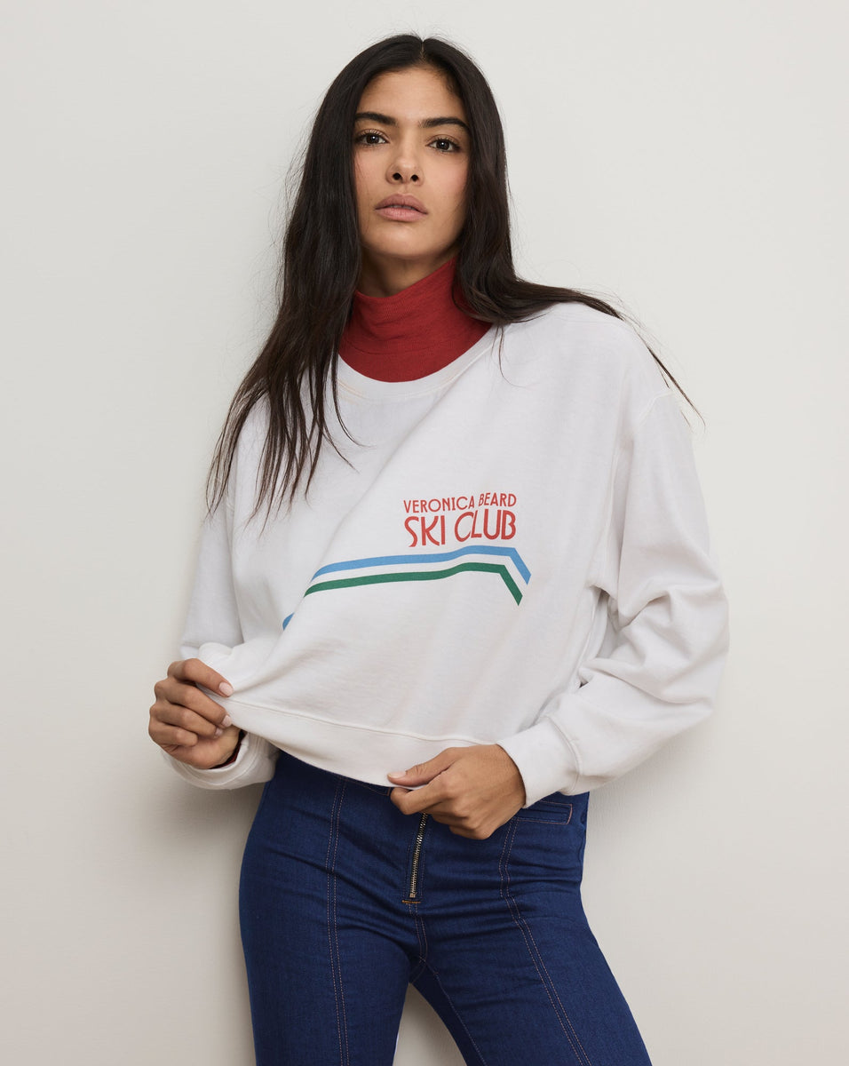 Bienvenue au VB Ski Club. Confectionné dans un mélange de coton filé à l'anneau, ce sweat-shirt offre un toucher ultra-doux. Orné d'un motif après-ski et de l'inscription « Veronica Beard Ski Club » sur le devant, il arbore l'inscription « Veronica Beard Sun Club » au dos. Sa coupe courte et décontractée est rehaussée d'un col rond classique et de larges bords-côtes aux manches et à l'ourlet. Le vêtement idéal à enfiler en un clin d'œil, parfait pour toutes vos aventures.