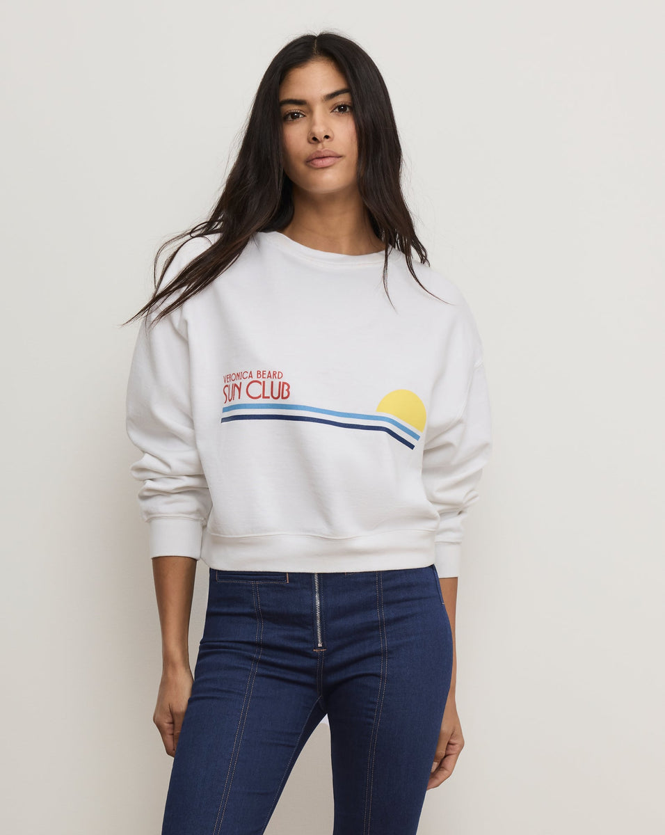 Bienvenue au VB Sun Club. Confectionné dans un mélange de coton filé à l'anneau, ce sweat-shirt offre un toucher ultra-doux. Orné d'un motif Après-Soleil et de l'inscription « Veronica Beard Sun Club » sur le devant, il arbore l'inscription « Veronica Beard Ski Club » au dos. Sa coupe courte et décontractée est rehaussée d'un col rond classique et de larges bords-côtes aux manches et à l'ourlet. Le vêtement idéal à enfiler en un clin d'œil, parfait pour toutes vos aventures.