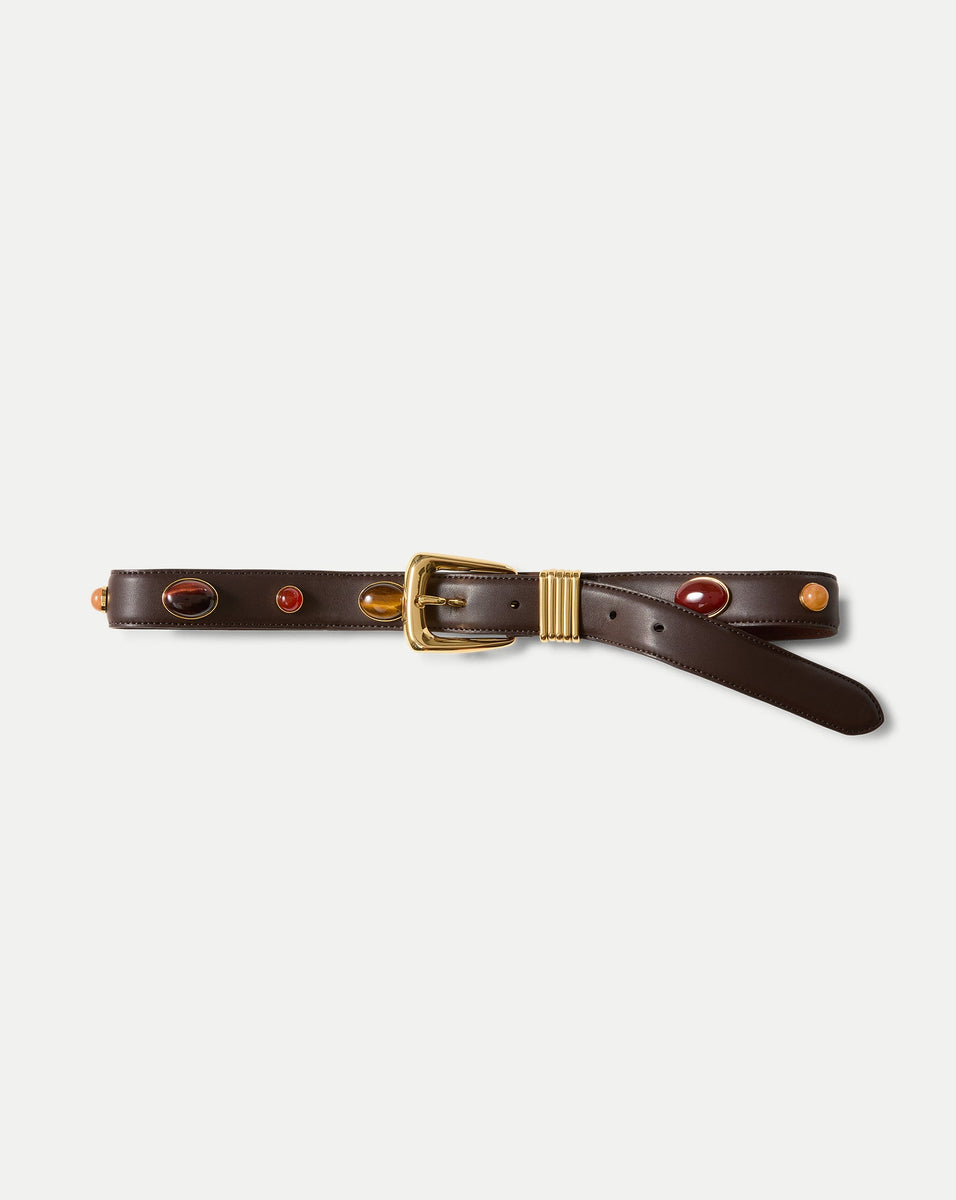 La ceinture classique en cuir marron, avec une touche d'originalité. Confectionnée en cuir lisse et poli, doublée de nubuck souple, la ceinture Arch est dotée d'une épaisse boucle à ardillon dorée et d'un large passant strié. Sur toute sa longueur, des pierres semi-précieuses – sardoine, topaze, jaspe et œil-de-tigre – apportent couleur et texture riches. Associez-la à des pièces minimalistes pour sublimer les détails.