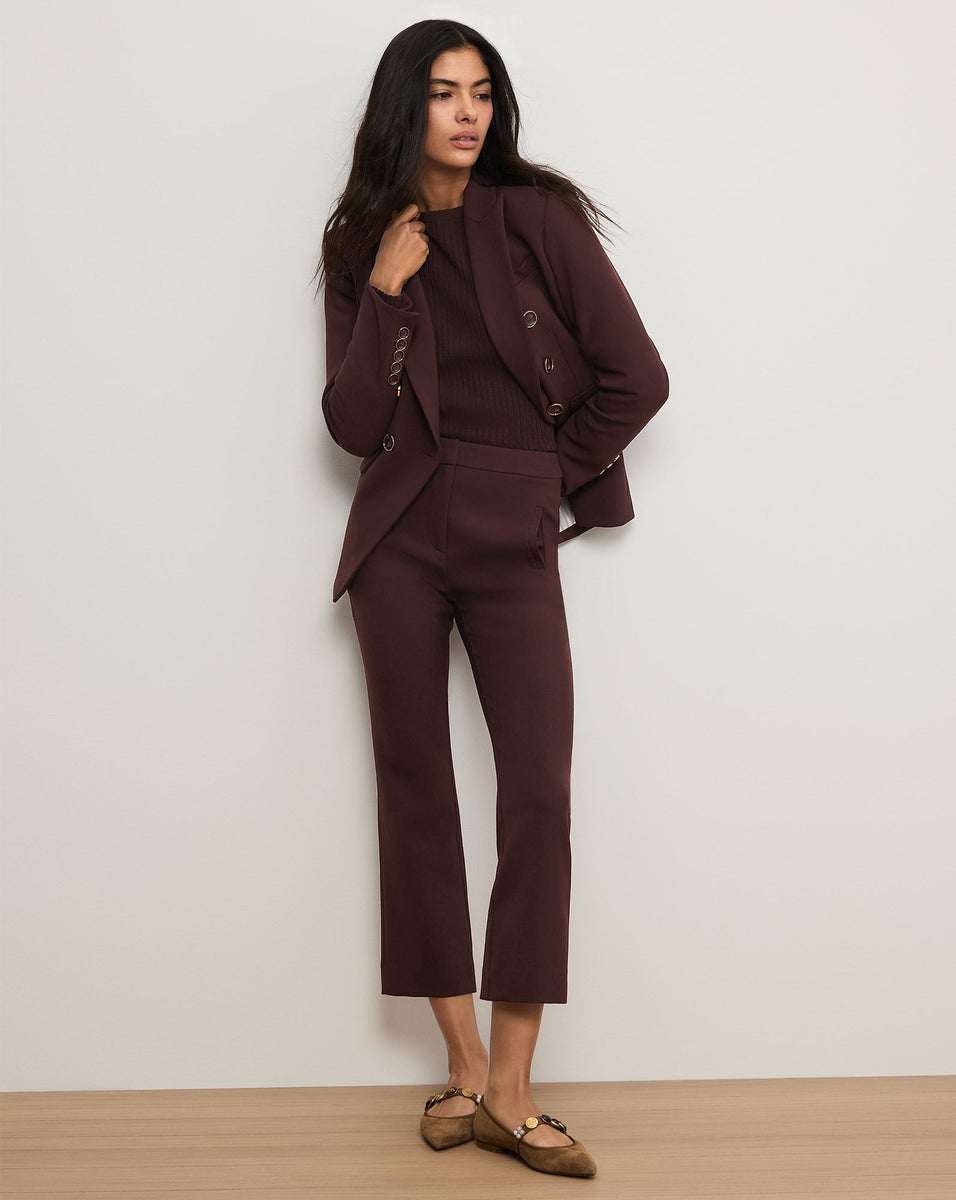 Un favori de VB, revisité en bordeaux profond. Le pantalon Arte est un modèle court taille haute à la coupe slim et à l'ourlet légèrement évasé, doté de poches passepoilées plates et d'une fermeture à crochets dissimulée. Confectionné dans notre tissu de costume de transition, il offre une élasticité subtile et un look soigné, idéal au quotidien. Associez-le à la veste Miller assortie pour un look élégant et ajusté.