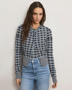 Crafted from a premium stretch knit, the Cambria cardigan features a blue ripple diamond jacquard pattern for a modern take on prep. Designed for a slim fit, it features a classic crew neckline, contrasting striped trim, and extra-wide hem. Mini tortoise buttons complete the look. Pair with wide-leg denim and heeled booties for an elevated day look.
