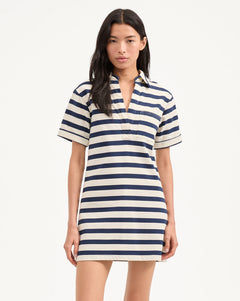 La robe polo de tous les jours, à enfiler avec tout. La Cayden est confectionnée en 100 % coton épais pour une sensation structurée mais confortable. De coupe carrée avec des manches mi-courtes extra-larges, le corps rayé bleu marine et blanc présente un col rabattu classique, une patte de boutonnage sans bouton et une poche plaquée sur le devant. Portez cette robe courte avec des baskets pour un look décontracté et cool, ou associez-la à des sandales à lanières ou des ballerines pour une allure plus raffinée.