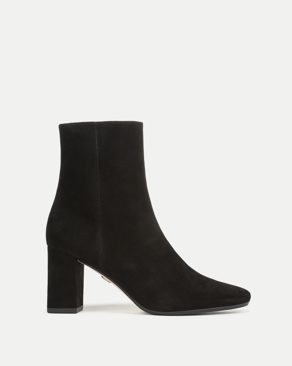Un incontournable de votre garde-robe. La bottine Cera est confectionnée en daim noir premium et conçue pour être portée de jour comme de nuit. Élégante et intemporelle avec sa tige minimaliste, elle est dotée d'un talon carré légèrement pointu et d'une fermeture éclair latérale pour plus de confort. Un V surpiqué à l'arrière de la cheville est un clin d'œil subtil à la marque. À porter avec un jean pour un look décontracté au quotidien.