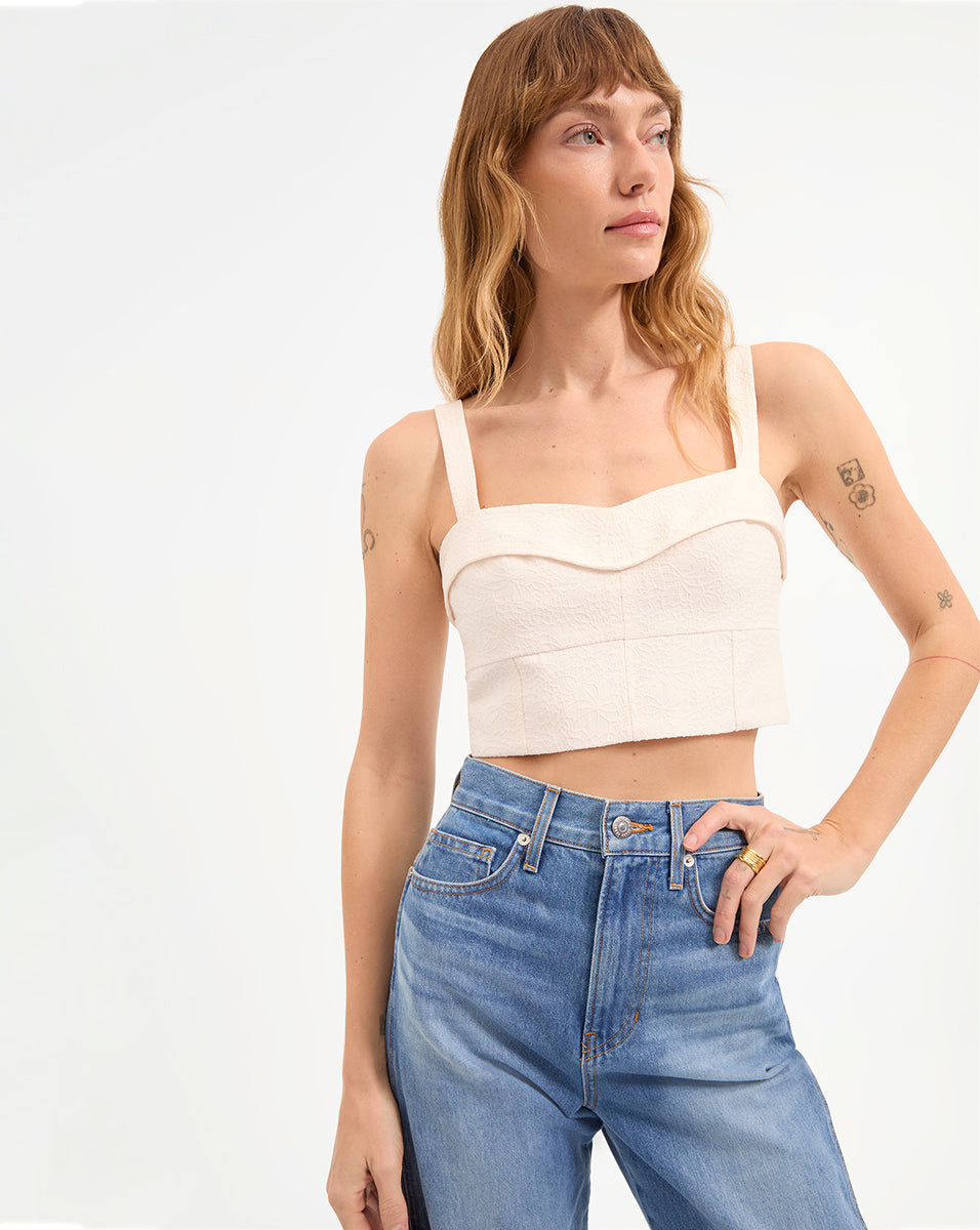 Version rehaussée du débardeur court, le Faxon est confectionné en jacquard tissé blanc avec un motif floral ton sur ton. Ajusté au niveau du corsage, il présente des passepoils et des surpiqûres ton sur ton sur l'encolure carrée et le dos, ainsi qu'une fermeture éclair latérale dissimulée et de larges bretelles réglables pour plus de facilité. Portez ce débardeur court en jacquard avec la jupe Fellini assortie ou optez pour une tenue plus décontractée avec un jean taille haute.