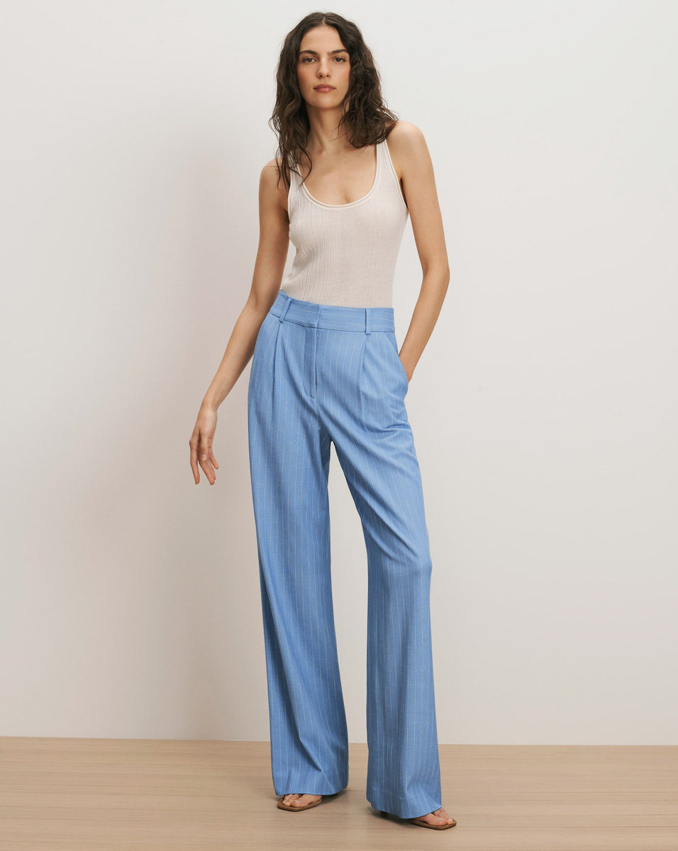 A relaxed, roomy pant that still feels polished. Expertly tailored from midweight stretch-viscose suiting with a slub texture and slight sheen, the blue pinstriped Heyser trouser features a high-rise, wide-leg silhouette that's softly draped through the thighs. Front pleats ensure ease of movement. Finished with a clean waistband, side slip pockets, and back welt pockets, it pairs well with a simple tank or pullover—or, for a power suit, the coordinating Miller dickey jacket.