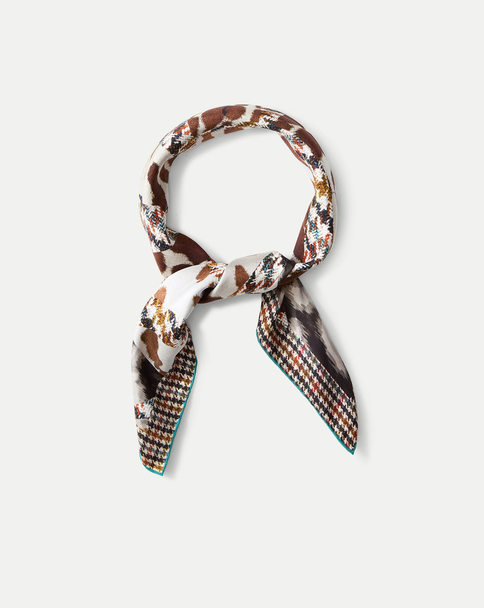 Une touche finale chic pour tous vos looks. Confectionné avec soin en Italie en 100 % soie, ce foulard bandana associe un motif pied-de-poule marron et blanc à un imprimé animalier pour un design richement superposé, une exclusivité VB. Nouez-le autour du cou avec une chemise boutonnée impeccable pour un look quotidien raffiné, ou enroulez-le autour des anses de votre Dash Bag pour une touche d'imprimé. Pierre-Louis Mascia est un illustrateur français devenu designer, connu pour ses imprimés audacieux façon collage, mêlant motifs et couleurs inattendus. Lancée en 2007, la marque a débuté avec des foulards et s'est depuis diversifiée avec des collections de prêt-à-porter et de décoration, toutes produites en collaboration avec l'imprimerie italienne Achille Pinto.