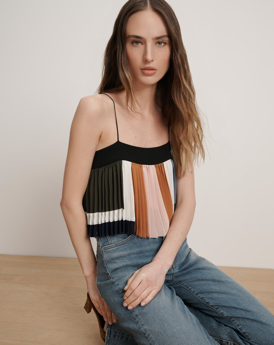 Amusant, ludique et chic. Le débardeur Janie se distingue par ses plis accordéon fluides et ses couleurs vives, créant une silhouette dynamique et percutante. Parfait seul ou sous un blazer chic, c'est le haut qui fait sensation. Associez-le à un jean ou un pantalon cargo pour un contraste tendance, ou portez-le avec une jupe longue fluide pour une élégance décontractée.
