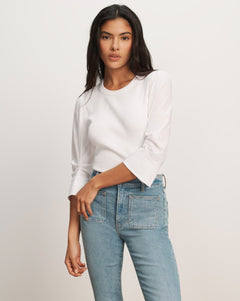 The button-down shirt meets the classic tee. The white Junia top features the body of a relaxed T-shirt—in soft, ribbed pima cotton—and the crisp cotton sleeves of an Oxford shirt, complete with roll-up cuffs. A clean crew neckline completes the look of this elevated essential. Wear it solo or as a versatile layering piece.