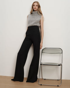 Le pantalon ponte, perfectionné. Confectionné en maille de viscose lisse et extensible noire, le Kalinda présente une coupe ultra-large avec une taille haute de 7,5 cm pour une coupe élégante et flatteuse. Un pli marqué sur le devant apporte élégance et structure, tandis que la fermeture éclair invisible au dos assure une finition impeccable. Alliant la facilité d'un pantalon à enfiler au raffinement d'un tailleur, il se porte aussi bien au bureau qu'en week-end.