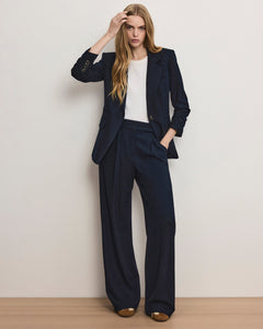 Un pantalon ample et décontracté, à la coupe impeccable. Découvrez le pantalon Marbeau bleu marine : une silhouette taille haute à jambes larges et au drapé fluide. Confectionné avec soin dans un mélange stretch haut de gamme, ce pantalon plissé est agrémenté de poches latérales diagonales. Portez-le avec un t-shirt blanc pour un look décontracté ou avec un blazer bleu marine pour un tailleur-pantalon élégant et sans effort.