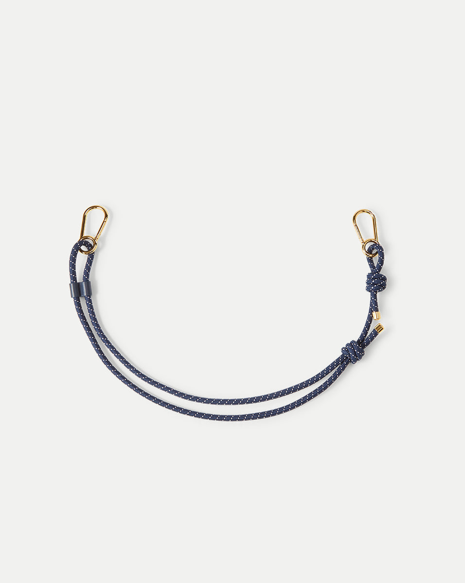 À la fois sportive et chic, cette bandoulière de sac tendance ajoute une touche utilitaire à vos accessoires préférés. Fabriquée en paracorde mouchetée à tissage épais, la conception à double boucle est dotée d'une attache en cuir coulissante pour un réglage sans effort et se fixe solidement avec un mousqueton surdimensionné. Les nœuds tendance et les pointes décoratives dorées confèrent une finition raffinée et raffinée. C'est le compagnon idéal du sac Veronica Beard Dash.
