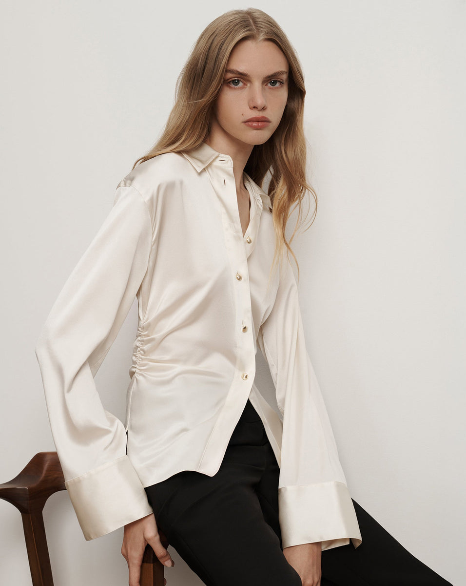 Une version luxueuse de la chemise boutonnée classique. Confectionnée en satin de soie stretch ivoire, la blouse à col Shiona présente une silhouette ajustée et ajustée, avec des fronces latérales qui soulignent la taille. Un ourlet en biais, des manches évasées aux poignets surdimensionnés et des boutons dôme dorés complètent le look. À associer à un jean bleu classique pour sublimer votre quotidien.