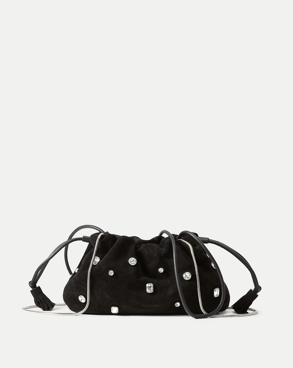 A petite, statement-making take on our classic Stash bag. Crafted from black Italian suede and embellished with assorted crystals, this pouch features a softly structured silhouette with a gathered, cinchable top, finished with leather tasseled drawstrings at both ends. Two straps—one in smooth leather, the other a silver snake chain—offer maximum versatility. Inside, a zip pocket and magnetic tab closure keep your essentials secure.