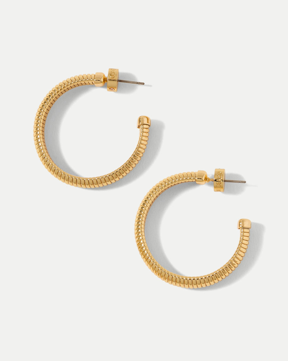 L'incontournable créole, désormais dotée d'une finition texturée tendance. Cette imposante boucle d'oreille style Tubogas est composée de fines bandes de laiton plaqué or 12 carats entrelacées pour un effet strié. Elle est dotée d'une tige en acier chirurgical, idéale pour les oreilles sensibles, et d'un fermoir à barre pour plus de confort et de légèreté. D'une polyvalence infinie, elle se porte de jour comme de nuit.