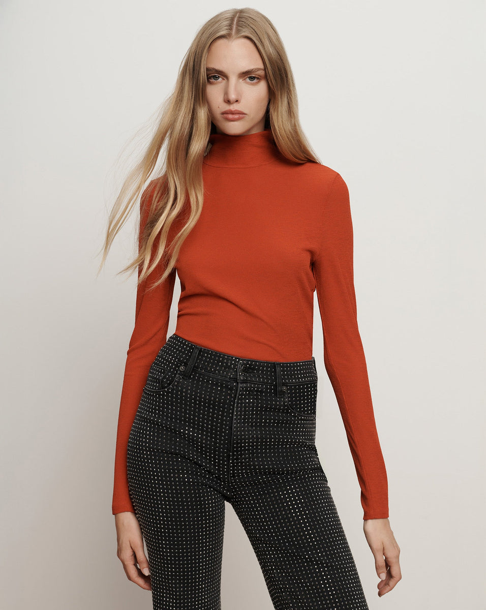 Une pièce incontournable que vous porterez sans cesse. Le Wyeth est confectionné dans une maille extensible délicate et semi-transparente qui épouse les formes du corps pour une coupe ajustée et effet seconde peau. Avec son col roulé haut et ajusté et ses poignets aux finitions soignées, ce haut rouge cornaline est parfait seul ou superposé sous un blazer, un cardigan ou un pull.