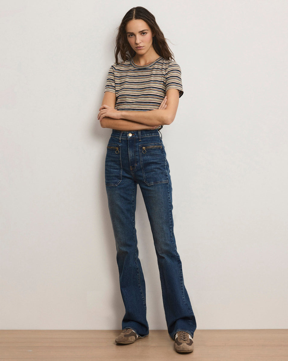 Our bestselling Beverly skinny-flare jean—now with zippered patch pockets for a modern, utilitarian edge. Made in LA from super-stretch Italian denim, it features the high-rise waist and subtly flared leg you know and love, fitted through the hips and thighs for a flattering, leg-lengthening silhouette. Tuck these patch-pocket jeans any of our tops and add sky-high heels for an effortlessly chic, head-turning look.