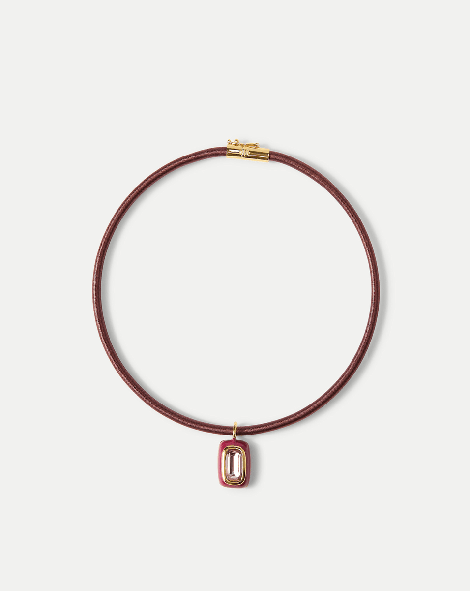 An effortless necklace to elevate the everyday. Falling just below the collarbone, it’s crafted from rounded burgundy cord and features a glass rectangular pendant with white enamel and 12-karat gold-plated brass accents—fastening securely with a barrel clasp, for ease. Equal parts polished and cool, it boasts a wear-everywhere versatility—style with a simple V-neck, or layer over a turtleneck.