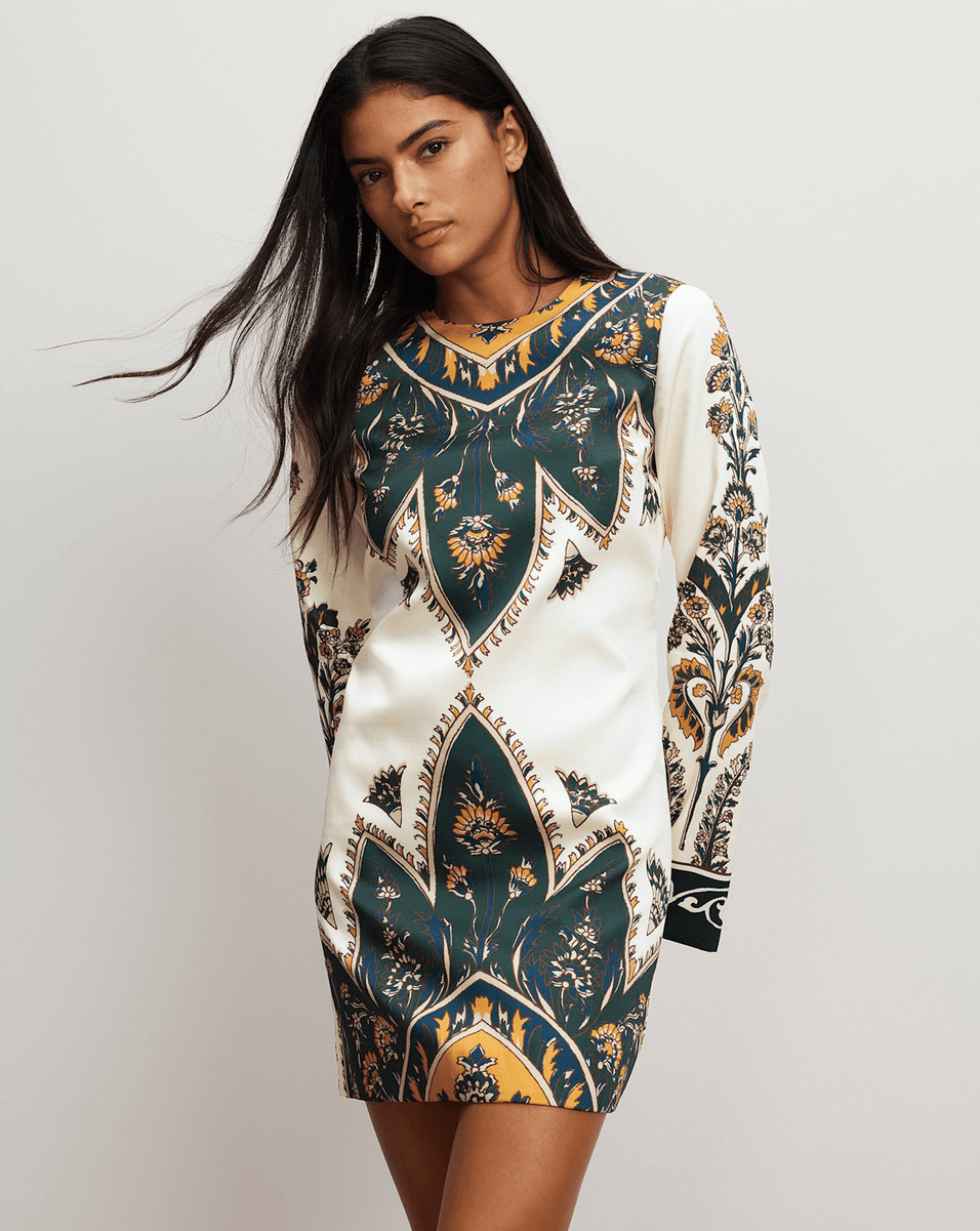 The timeless shift dress—reimagined in the season’s must-have print. Lightweight with a silk-like finish, the Cromwell mini dress features an allover scarf motif and a slim, body-skimming fit with subtle waist darting and flared long sleeves. A clean crew neckline and hidden back zip complete the design. The perfect desk-to-dinner piece—polished with flats for day and heels for night.