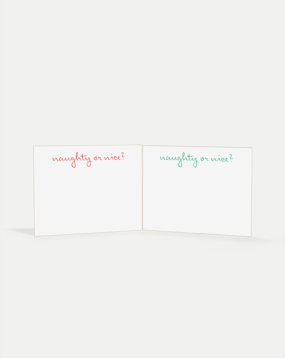 A playful addition to your tablescape. Crafted from smooth, heavyweight paper, these place cards add both charm and intention to your next holiday dinner party. Each card reads Naughty or Nice? in alternating red and green script, finished with a gold-painted edge. They’re the perfect way to seat your guests and set the tone for the evening.