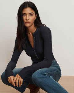 A foundational piece you’ll reach for again and again. The Drexler henley shirt is crafted from a delicate, semi-sheer stretch rib knit that softly hugs the body for a slim, flattering fit. A satin-trimmed deep V-neckline and placket add subtle contrast and shine, finished with stone snaps for a modern touch. Tuck this navy tee into your favorite VB denim for polished ease.