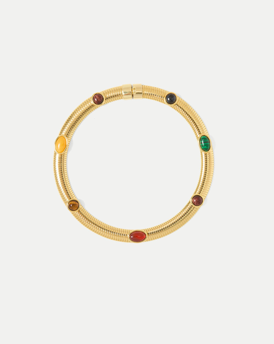 The statement necklace—perfected. This Tubogas-style collar is constructed with fine, interlocking 12k gold-plated brass strips, creating fluid movement and flexibility and a ribbed-like finish. Embellished with bezel-set cabochon stones for a hint of bohemian charm, it’s finished with a box clasp for ease. Bold yet sleek, it’s your new go-to for instant polish.