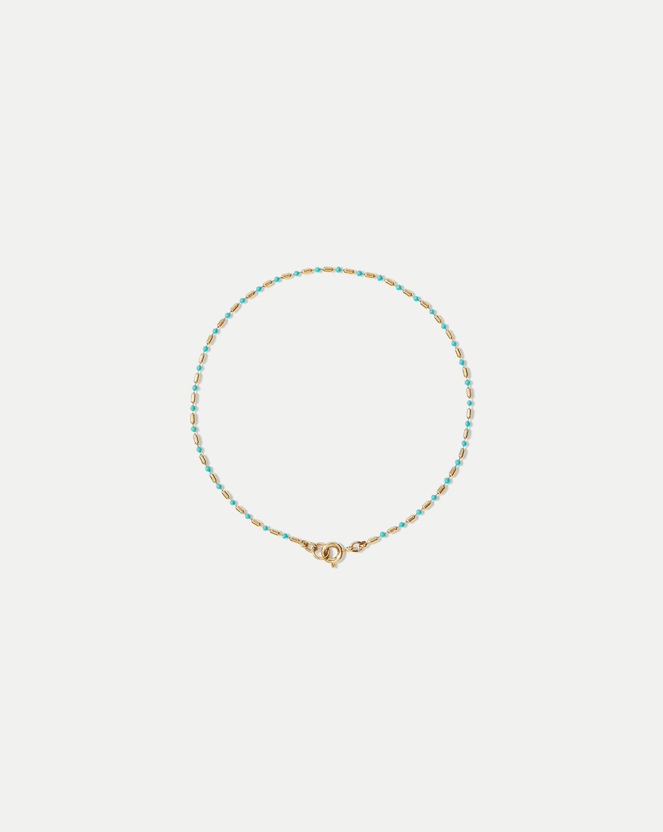 The everyday anklet, ready for wherever your summer may take you. This dainty chain features a mix of gold-toned and turquoise enamel-covered beads, featuring IP plating for added durability and water resistance and securing with a Q clasp for ease. Wear it solo or layer with other colors—it’s perfect for the beach, the pool, and beyond.