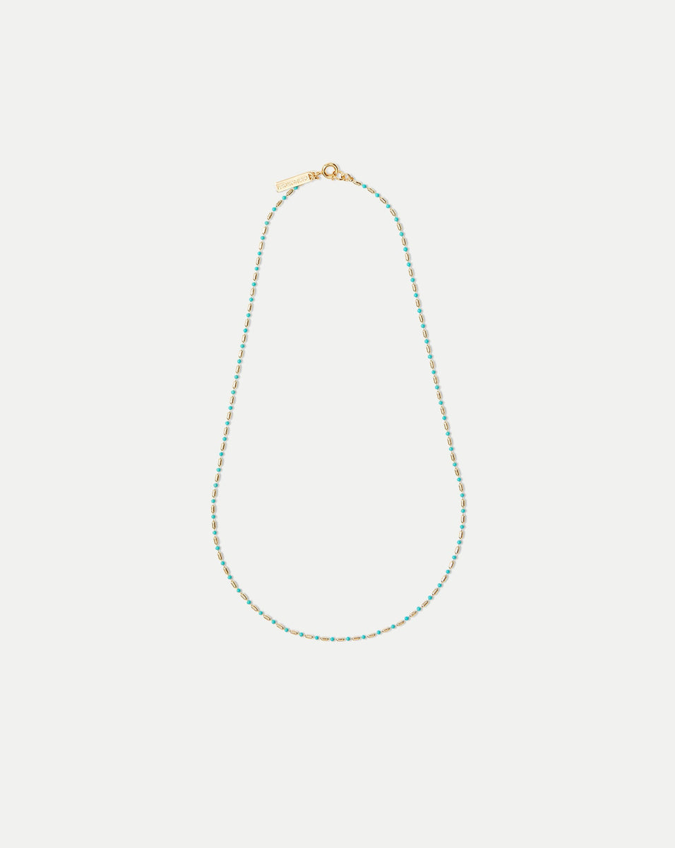 The effortless everyday necklace, made for layering. This dainty, 16-inch chain features a mix of 12-karat gold-plated brass and turquoise enamel-covered beads, securing with a Q clasp for ease. Layer with the Long Enamel Bead Chain Necklace (or two, or three), mixing and matching colors, and style with your favorite VB tees, tank tops, and swimwear.