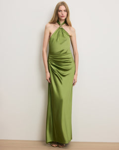 RSVP-ready, in vibrant chartreuse green. Made from lustrous silk satin, the Izaren maxi dress features a dramatic halter silhouette that skims the body while side ruching and stretch ensure a flattering fit. Gold metal hardware accents the neckline, and an extra-long self-tie in the back doubles as its own design detail. Style with gold jewelry and heels to play off the metallic touches.