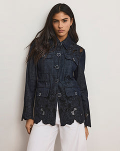A romantic take on the classic field jacket, the Kiki is expertly tailored from premium cotton chambray. Its elongated silhouette features feminine details, including floral eyelets accented with contrast embroidery, while an adjustable bungee waist provides a cinching effect. A sharp point collar, chest pockets, and oversized hip pockets add a utilitarian touch. Polished yet effortless, this navy jacket pairs perfectly with the matching Osborne pant.