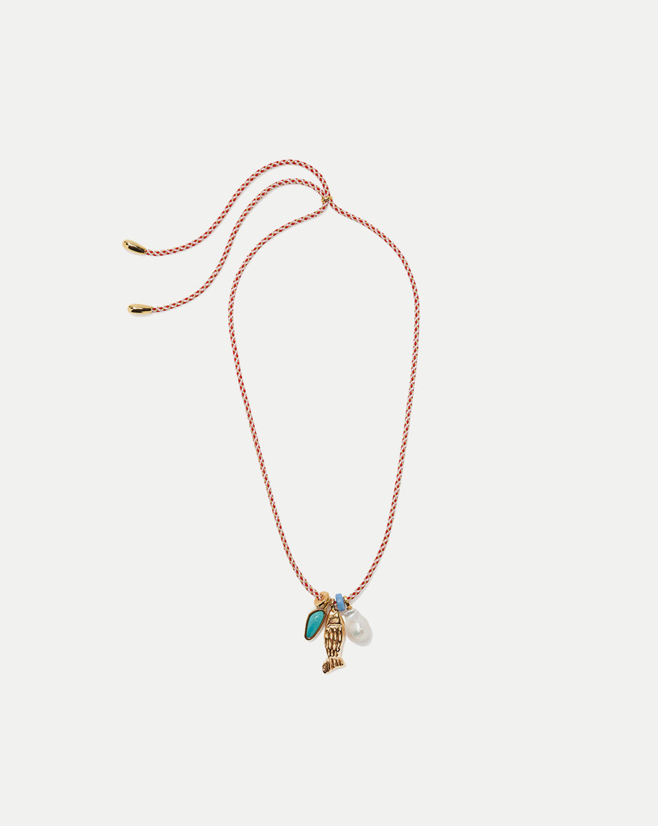 - Adjustable red silk cord, glass and gold-plated beads, gold-plated etched fish pendant, freshwater pearl charm, and turquoise stone charm
