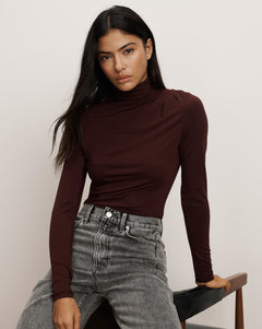 An essential, elevated. Crafted from soft stretch jersey in brown, the Mylie reimagines the simple mock-neck top with subtle ruching on the sides and a contoured, body-hugging fit. This is the ultimate foundation piece—dressed up or down, perfect on its own or as a base layer.