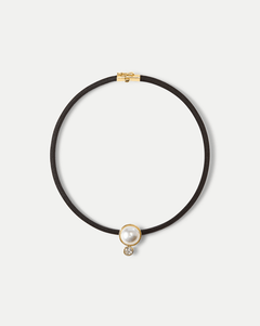 The pearl necklace—made modern. Falling just below the collarbone, this black leather cord necklace features a white pearl and crystal pendant, set in 14k gold-plated brass. A secure barrel clasp ensures easy wear. Polished yet cool, pair it with a V-neck or layer over a turtleneck.