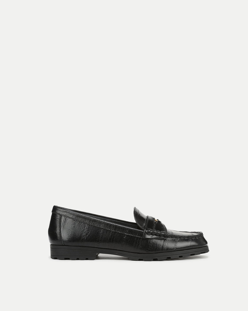 A closet must-have. Crafted from premium black eel-embossed leather, this classic penny loafer is one you’ll reach for season after season. A subtle lug sole gives the timeless silhouette a modern edge, while our signature VB crest accents the vamp slot—a nod to the traditional penny. A shoe that works with everything, style it with straight-leg jeans and a tee for a classic day look.