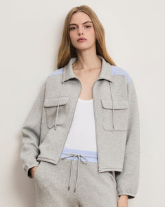 Off-duty, done right. Made from stretch scuba with a double-knit construction, the grey Stellant zip-up jacket delivers both structure and all-day comfort. A drawstring neckline adds ease while the striped yoke in the back—in blue and white shirting—creates cool contrast. Pair this grey knitted jacket with the matching Ernie pant for a more refined take on the sweatsuit. It's perfect for days on the go—and travel.