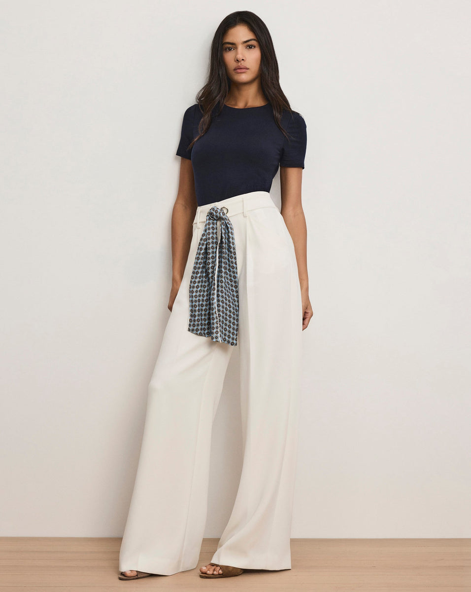 Crafted from luxe Japanese crepe, the Tai pant in off-white combines refined tailoring with fluid movement. Designed with a wide-leg silhouette and high Hollywood waistline, it features a removable tonal belt with metal grommets and a foulard scarf for styling versatility. Pair with a simple T-shirt and strappy heels to let the pants take center stage.