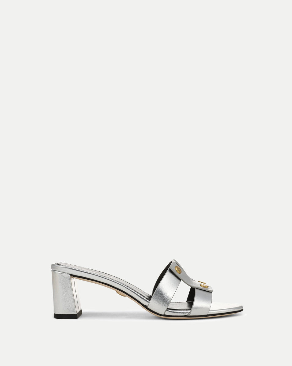 Crafted from high-shine silver leather, the Via open-toe sandal is party ready. It features a clean, multi-strap design punctuated by gold hardware and a two-inch block heel—high enough to flatter, low enough to dance in. A cushioned footbed ensures comfort. Style with an LBD for a special night out—or wear with jeans to elevate the everyday.